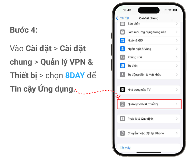 Buóc 4:Vào Cài ??t > Cài ??t chung > Qu?u ly VPN & thi?t b? > ch?n 8day ?? Tin c?y ?ng d?ng